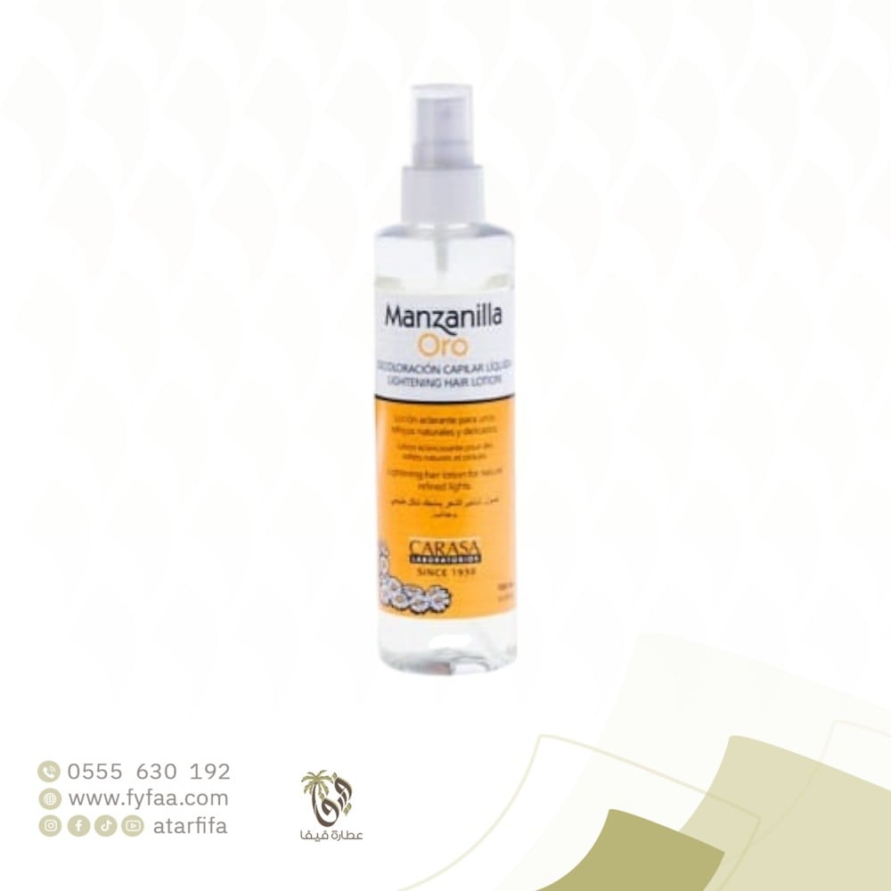 بخاخ تفتيح لون الشعر مانزانيلا اورو من كاراسا :بخاخ الشعر بمستخلص البابونج الذي يعمل على تفتيح لون الشعر. لا يعتبر كصبغة شعر للشيب.قومي برش المحلول على الشعر النظيف، ثم وزعيه باستخدام المشط، يمكنك التحكم بدرجة اللون الفاتح أو الداكن.مناسب جداً للشعر ذو اللون الفاتح.