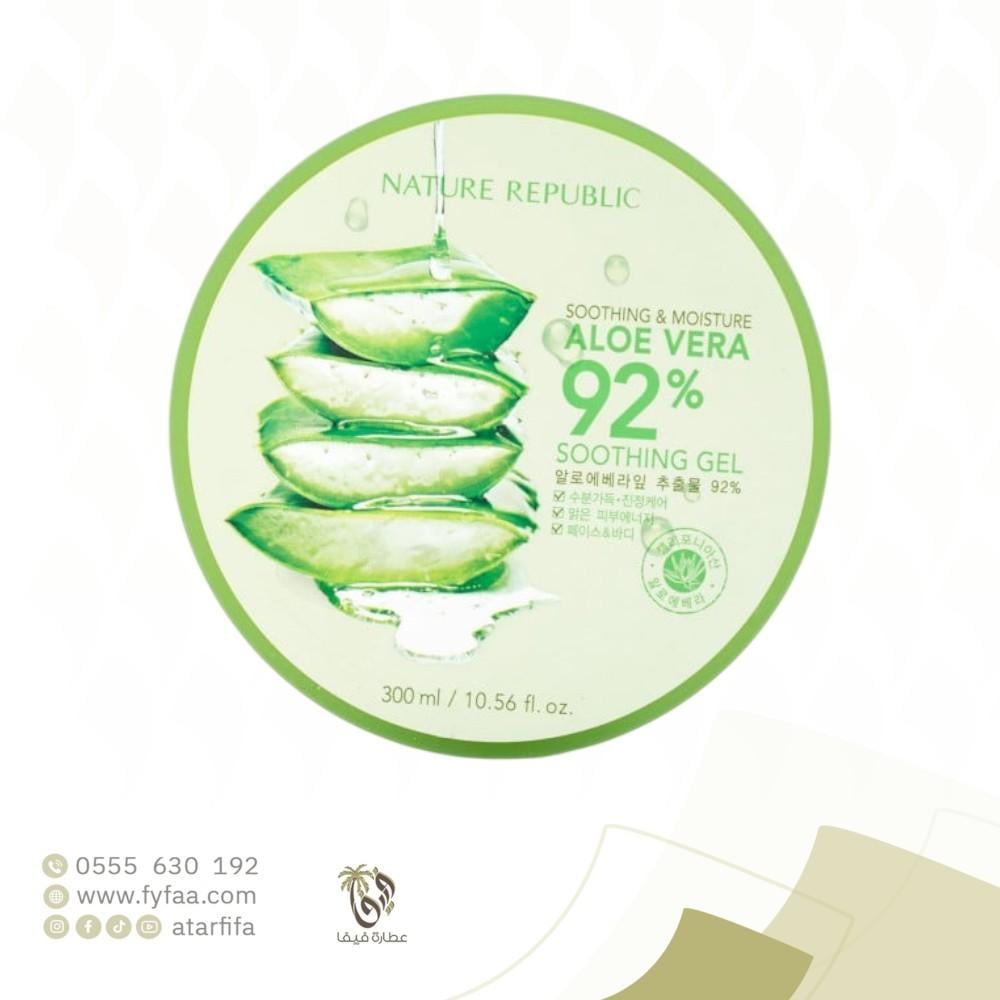 الجل الملطف مع 92% من صبار الطبيعي لتهدئة و ترطيب البشرة والشعر يحتوي على 92% من صبار الألوي الحقيقي الذي يخفف إحمرار و جفاف البشرة الذي تسببه أشعة الشمس, كما يوفر ترطيب عاليجل الترطيب هذا المكون من 92% من فيرا الألوي مرخص من قبل مزارع كاليفورنيا العضوية المعتمدة يمكن استخدامه لترطيب أجزاء مختلفة من الجسم مثل الوجه, اليدين, الأرجل و الشعربسبب جودته العالية